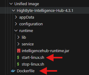 In addition to the Intelligence Hub, a couple additional files will be necessary: A "Dockerfile" and a modified "start-linux.sh" script.