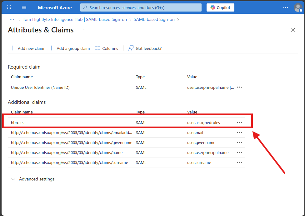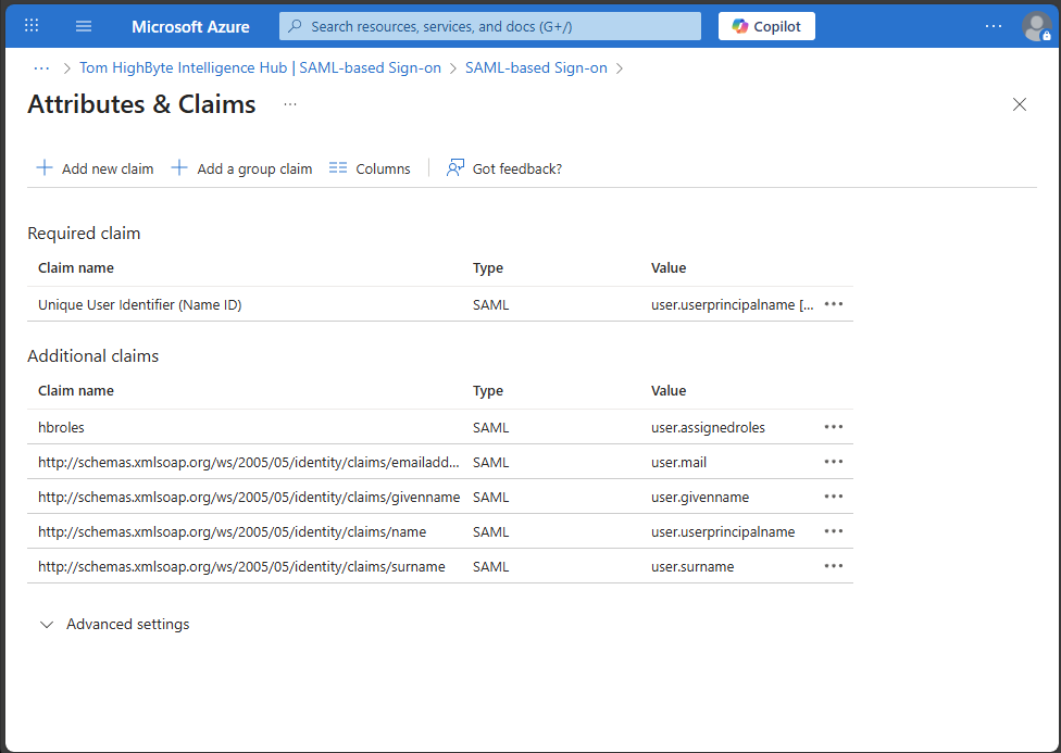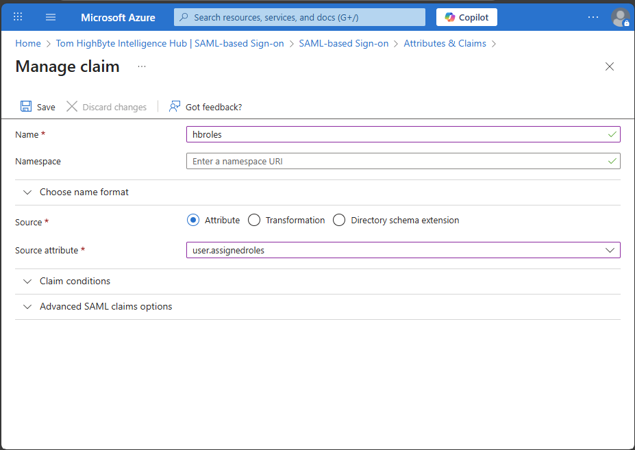 Now the users and roles should be configured and passed from Azure Entra ID back to HighByte Intelligence Hub via the user's browser using SAML. The final step is to inform Intelligence Hub where to pick up the role identifier and fill the custom.roleNameAttribute defined above.