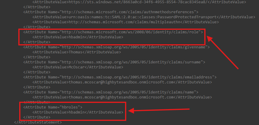 In the case configured in this article, the custom.roleNameAttribute will be set to "http://schemas.microsoft.com/ws/2008/06/identity/claims/role"