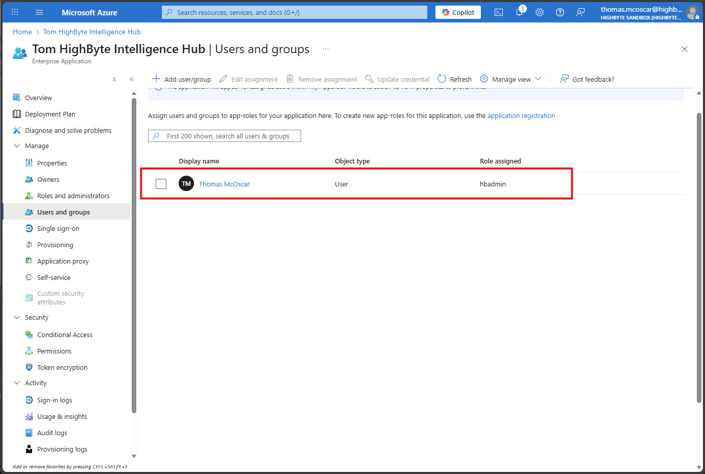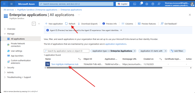 Once the Enterprise application has been created, you should be redirected to Microsoft Entra ID > Enterprise Applications. Your application for Intelligence Hub should be visible. You may need to refresh the list.