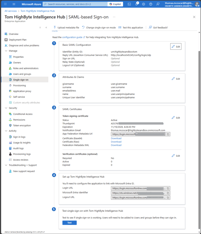 - idp.x509cert - The name of the IdP / Entra ID certificate stored in Intelligence Hub's certificate store. A representative name chosen by the user. The certificate will be generated by Entra ID, downloaded, and uploaded to Intelligence Hub over the course of this setup