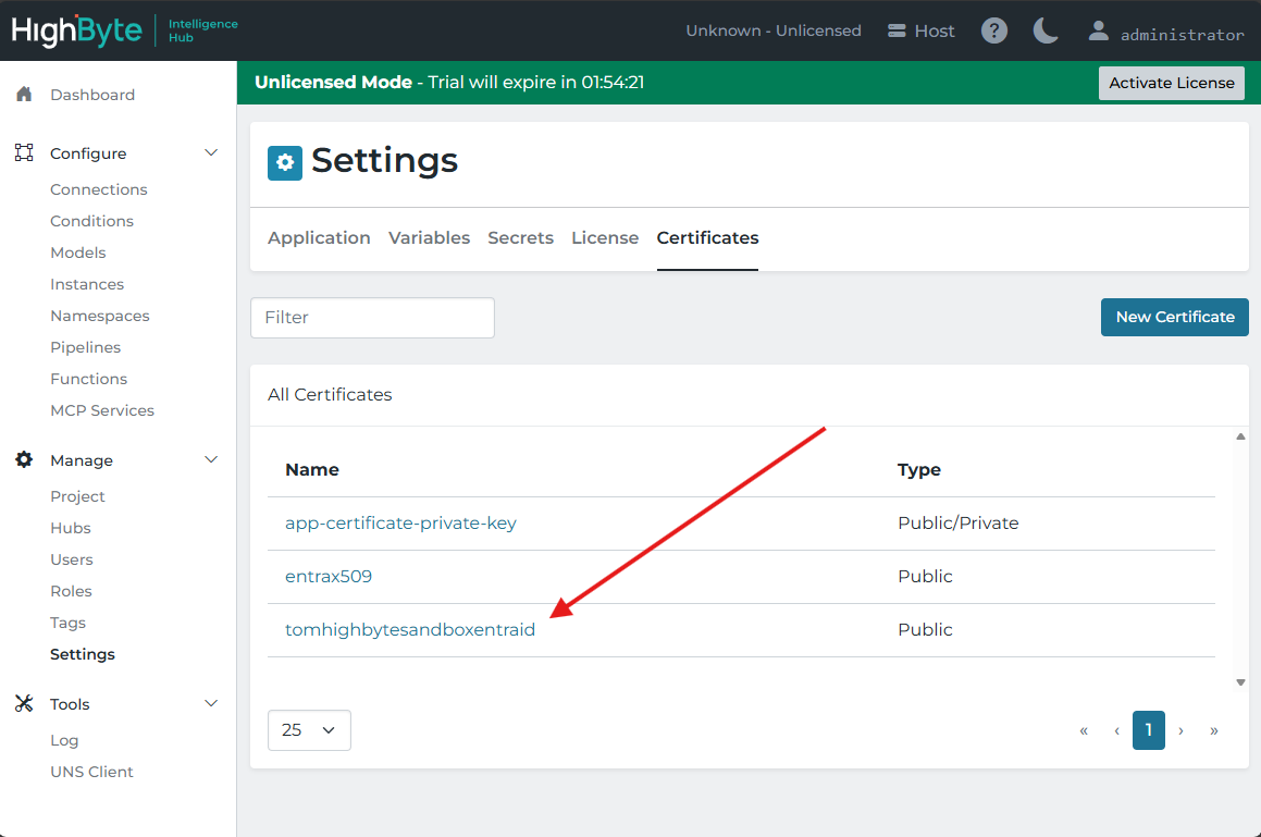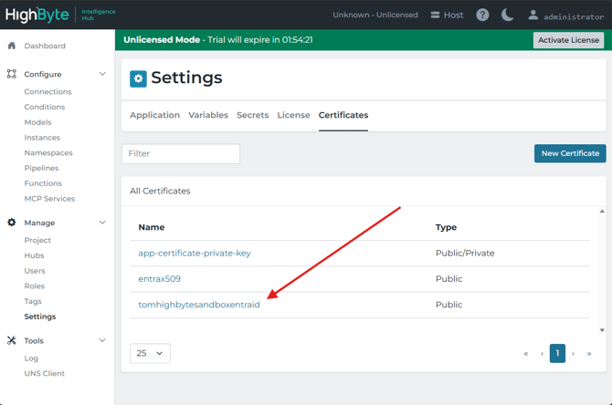 Log into intelligence hub using internal authentication and navigate to Settings > Certificates.