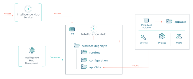 The basic installation of HighByte Intelligence Hub will include a deployment generating a single pod of Intelligence Hub, a service providing access to the pod, and a persistent volume providing durable storage. These components allow Kubernetes to restart the container (pod) if it crashes with the deployment, keep any configurations made (pipelines, connections, users, etc.) on the persistent volume, and provide users with a simple method to access the Hub through the service.