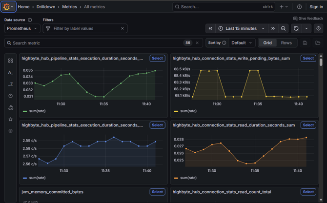 To drill down to a specific topic, find the top-level descriptive metric to be investiagted, and press the "select" button on the chart. Ofr instance, to inspect pipeline execution times, select the "highbyte_hub_pipeline_stats_execution_duration_seconds_sum" metric.