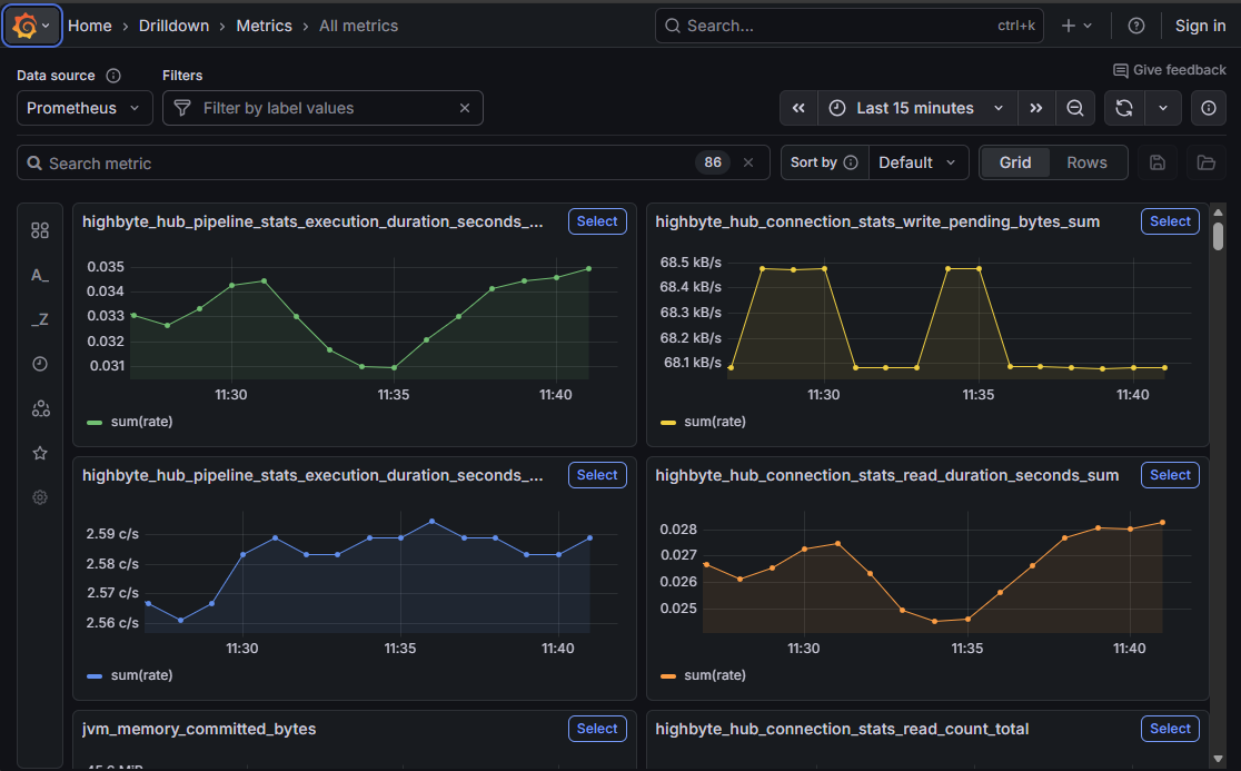 One instance of Grafana/otel-lgtm can host Otel data for multiple Intelligence Hub runtimes, and even other applications. These instances are all started wiht the common Otel endpoint. In addition to top-level metrics, these different applications and instances can populate topics that can be drilled down through to provide a finer view of performance. For instance, the metric highbyte_hub_pipeline_stats_execution_duration_seconds_sum shows an aggregate for all connected pipelines, but in the drilldown, individual pipelines can be observed, along with aggregates per Intelligence Hub.
