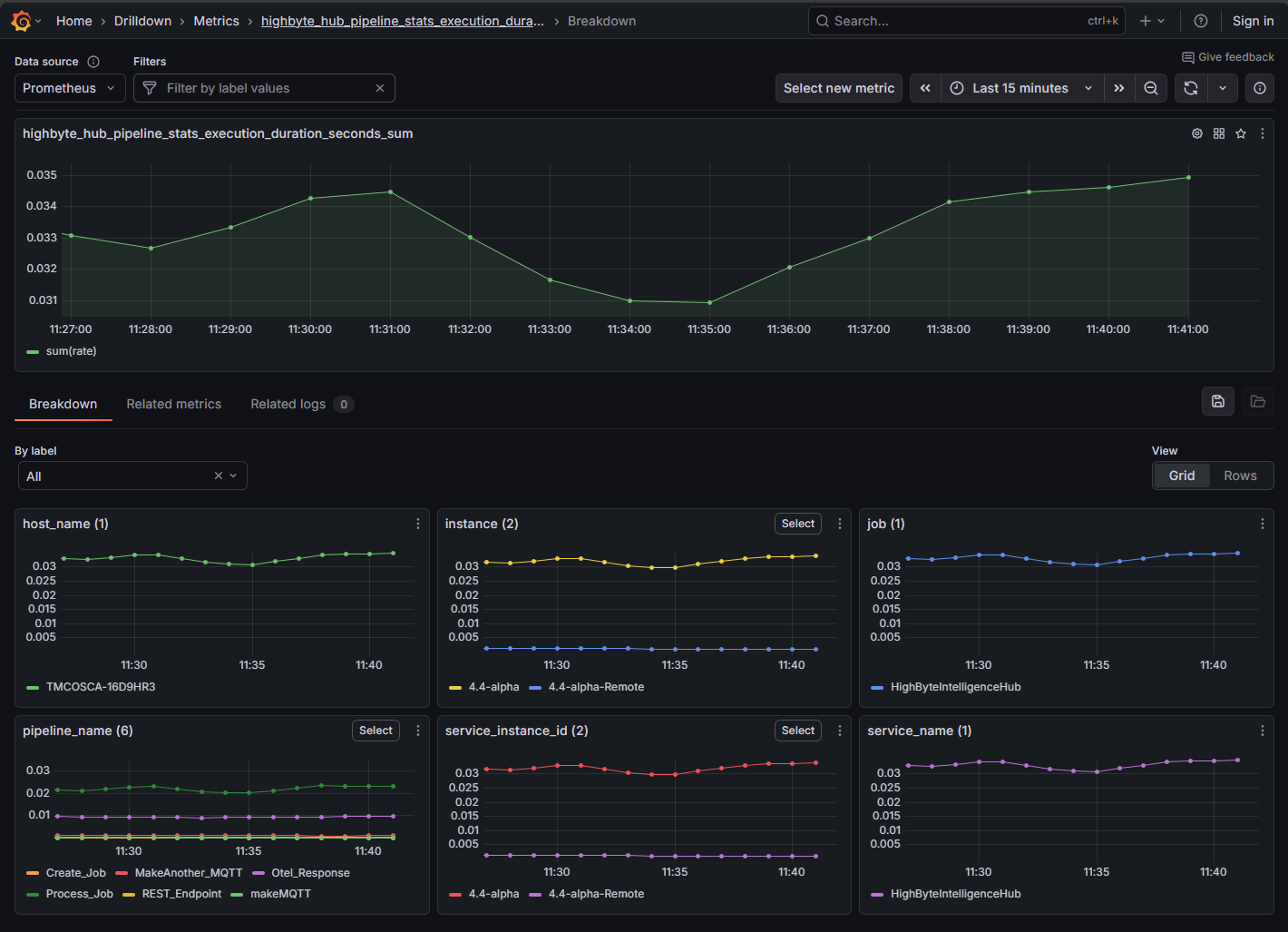 Grafana displays the top-level metrics of all systems as aggregates - e.g. all pipeline execution times are displayed as an average. However, metrics are collected for each instance of HighByte Intelligence Hub pointed to this OTel collector separately, as is each pipeline, connection, etc. By navigating into each of these metrics, finer metrics can be acquired through the drilldown features.