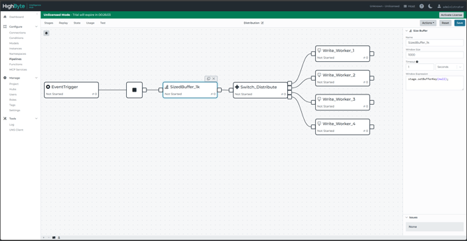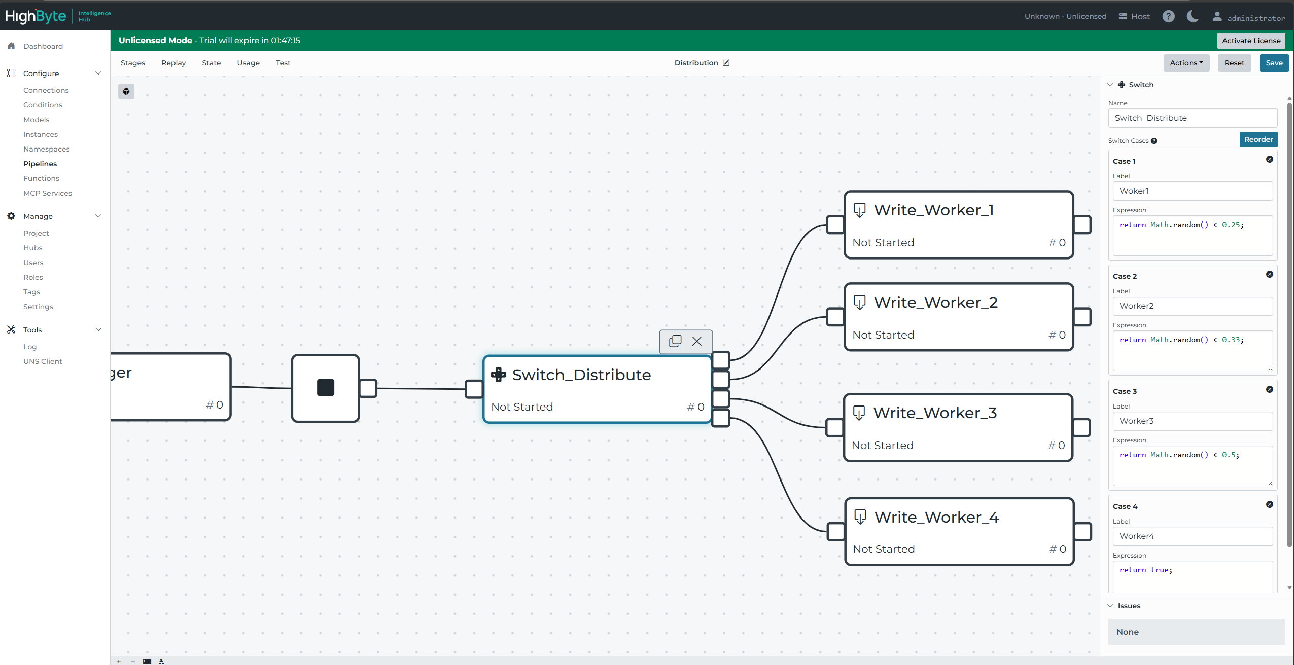 HighByte Intelligence Hub is designed to give the user tools to efficiently manage data streams of greatly varying bandwidth. Some pipelines can manage a single event every day, and some pipelines manage many events every second. When working with large or especially with very frequent datasets, it's important to consider efficiency and bottlenecks in data processing. Luckily, designing parallel data processing streams in Intelligence Hub is simple using switches and distributing incoming events into parallel identical "worker pipelines."