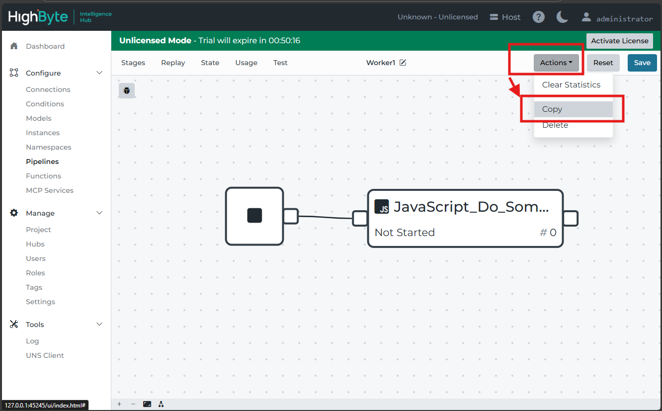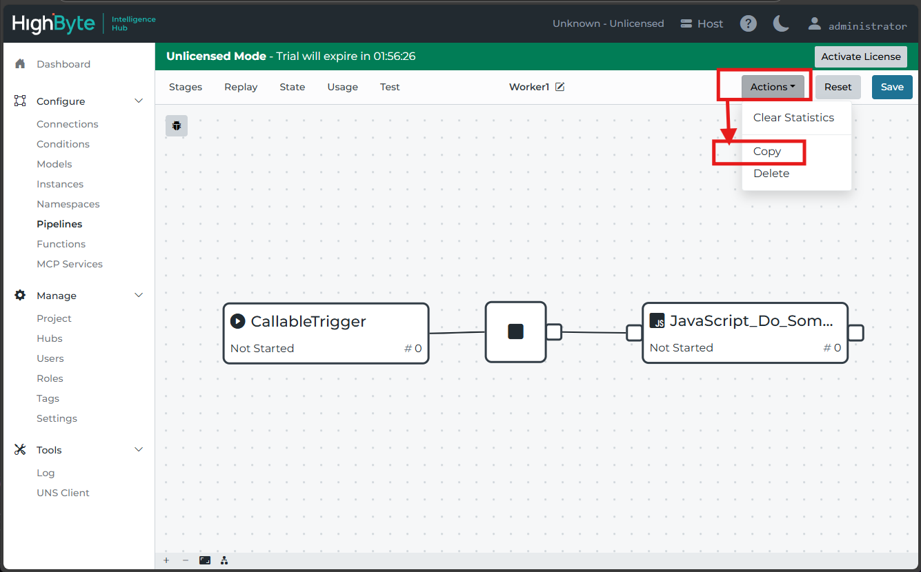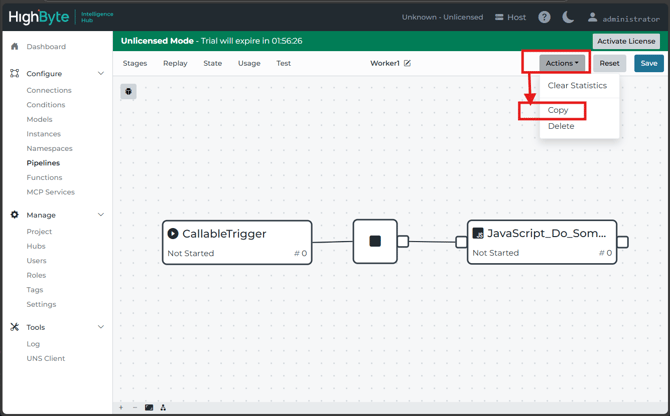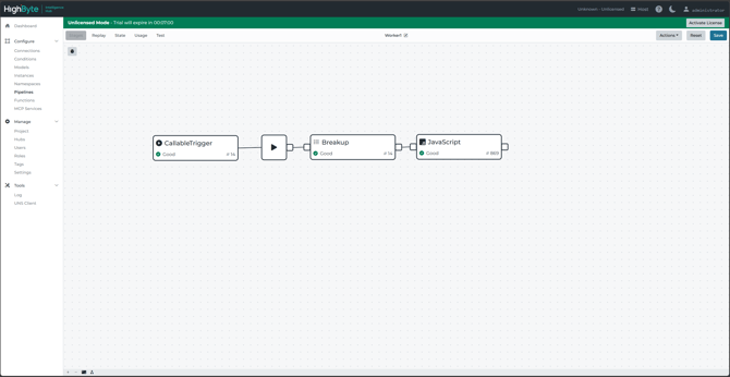 The most notable drawback of parallelizing data streams in HighByte Intelligence Hub to multiply bandwidth is the loss of opportunity to leverage state variables. Intelligence Hub is able to store persistent state variables within the scope of a pipeline to compare any given event to the events processed previously. However, by distributing events across identical parallel pipelines, and depending on the distribution method, it cannot be guaranteed that events process in the same order they are originally delivered, and they will not be processed immediately next to their original "neighbor" events. While it is possible that some clever pipeline distribution methods could solve this issue for a specific deployment, it demonstrates that parallelized solutions are not ideal for all workloads.