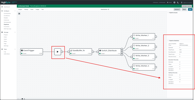As stated above, the most reliable method to evaluate the need and extent of parallel pipelines is to test in place. The pipeline statistics will be beneficial on both the pipeline stages and the start blocks. Selecting a stage - including the start block - will display statistics for that stage or the overall pipeline in the right-side pane. It will be important to watch that no errors are generated.