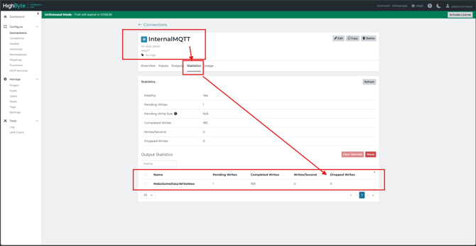 Errors from dropped writes will also appear in pipelines, but they can also be inspected in connection statistics where dropped writes can be viewed per output.