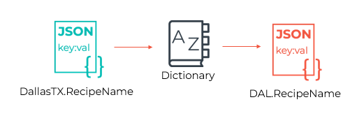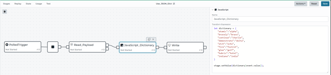 If a specific use case for the dictionary can be isolated from other projects, and reusability is not a concern, then a simple dictionary can be built in place in a JavaScript stage. In this case, it is ideal to create an object with the input value represented in the object attributes, and the output values as attributes. This would be the most technically efficient way to access. Any replacement or transformation would likely then be done in place in the same JavaScript stage. To retrieve the dictionary-translated value, the incoming value is used to access the dictionary using the square brackets operator of the object.