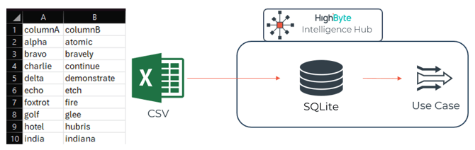CSVs are readily created in Microsoft Excel and are very familiar to many personas. Creating a dictionary with two columns (value A correlating to value B) or three columns (a line ID, and multiple values of A correlating to value B) makes an intuitive interface for most individuals to create a dictionary. This file should be saved as a CSV and placed somewhere readily accessible to HighByte Intelligence Hub. The CSV in the above image will be a reference for the demonstration of this method.