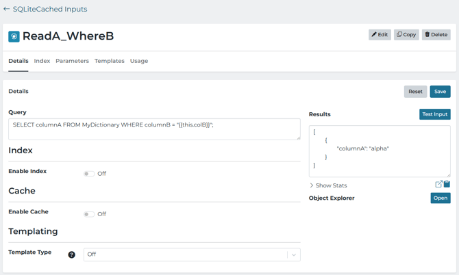 This SQLite database can now be used to read back a value using an input that is parameterized to look up against a provided value. And the same SQLite table can be used for both directions of transformation in many cases by creating an input per lookup direction. The following image reads a value from columnA based on a value given in columnB. A default value of "atomic" is provided in this example to demonstrate a test read. Any component using this input will need to provide a value for 'colB' as a parameter.