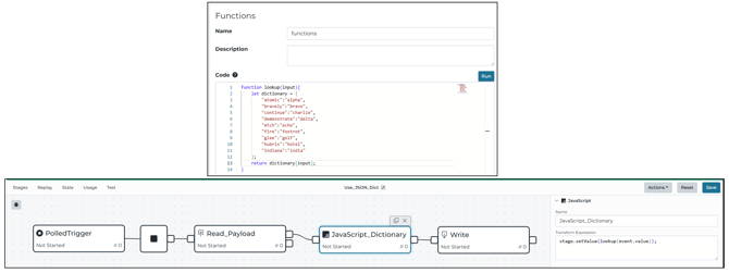 It is important to note from the above examples that none of these components or patterns are mutually exclusive. And additional options are still available to store dictionary JSONs like pipeline state variables, where they could be accessed from multiple points in a pipeline. JSON objects could be built in JavaScript stages to push into a SQLite database, and then the SQLite design pattern could be used without maintaining an external CSV file for translation.