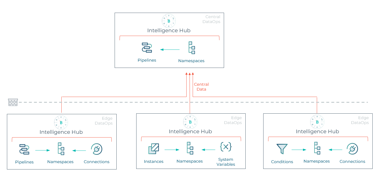 In HighByte Intelligencence Hub version 4.4.0 and onward, data can be "pulled" by a central hub from a remote hub using central configuration. Namespace federation can be configured to give a central hub access to data sources in a remote hub of the same network group. Any data source that can populate a namespace can therefore be extended for access by the central hub. This can be configured from a user-built namespace, or the HIghByte-inherent namespace.