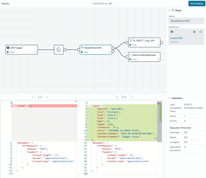 As an example of a custom endpoint, first import the Tutorial: Starter Solution and then import this project which adds a new motor001_to_API pipeline (shown below) to expose the motor001 payload with a REST endpoint.