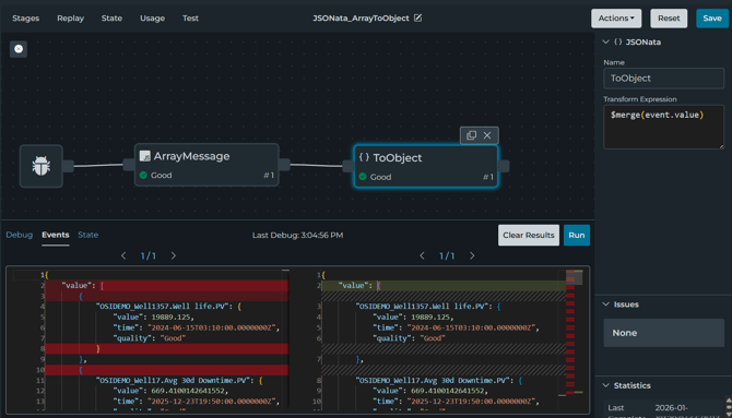 - JSONata_OPCUAArrayToPIOutputArray: This pipeline shows how to use JSONata to convert an OPC UA array to PI Output array.
