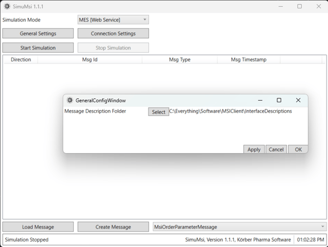 Download these interface descriptions in a file with an XML extension. Place this file into its own folder. Then, open SimuMsi. Set the General Settings to the folder of the interface descriptions. Once done, restart the SimuMsi client.