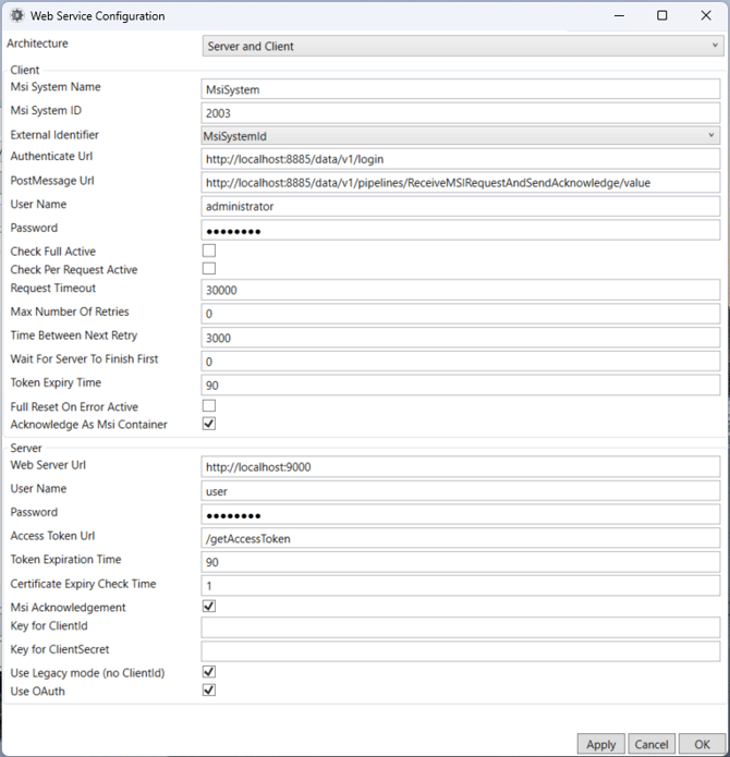 Next, make sure the Simulation Mode is set to MES [Web Service]. Open Connection Settings. Make sure the setting match what is defined in the screenshot. The Client Password is the password for the user in Intelligence Hub. The Server password should be "password".