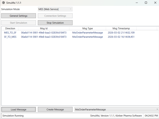 Now, you are ready to use the SimuMsi client. Press "Start Simulation". Next, you first need to create a message. Select Create Message. Then, populate the parameters and press Save.