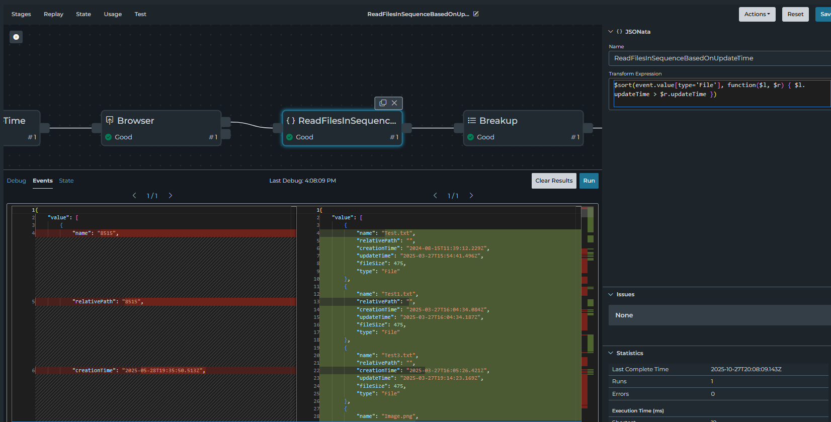 From the array, a JSONata stage is used to filter the array based on type = File and sort the array in ascending order based on updateTime. By sorting the array by updateTime will ensure that the files will be read by updateTime.